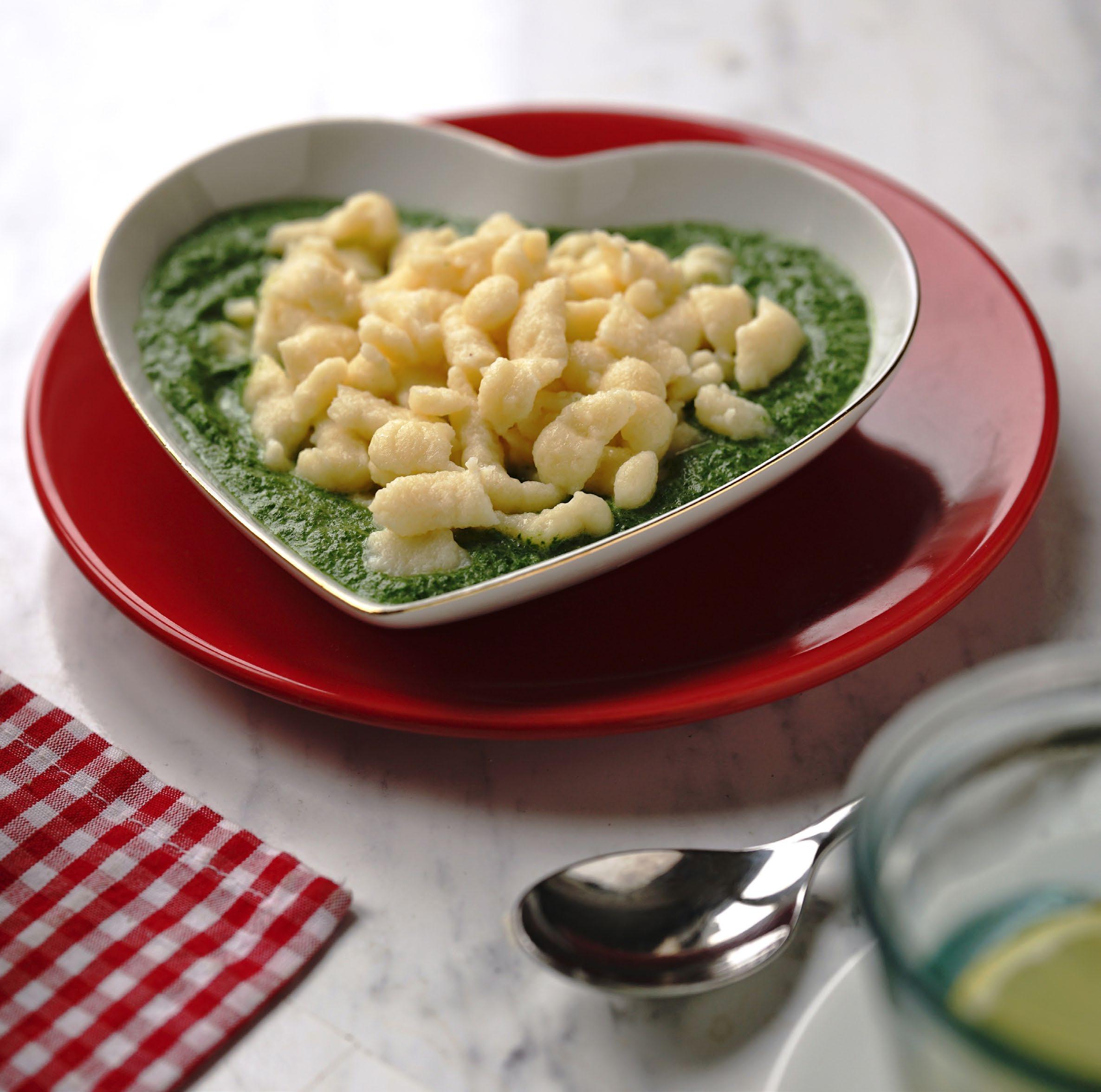 Tvaroh zamíchejte s vejci a mlékem. Postupně přimíchávejte hrubou mouku. Vznikne řídké těsto, které nechte cca 5 minut odpočinout. Mezitím si připravte velký hrnec s osolenou vodou a přiveďte ji k varu. Přes síto na halušky protlačte špecle přímo do vroucí vody. Zamíchejte je a nechte projít varem. Jakmile vyplavou na povrch, vylovte je sítem nebo slijte a dejte stranou. Na pánvi orestujte na troše přepuštěného másla plátky česneku. Cca po minutě přidejte čerstvé listy špenátu a nechte je zavadnout.