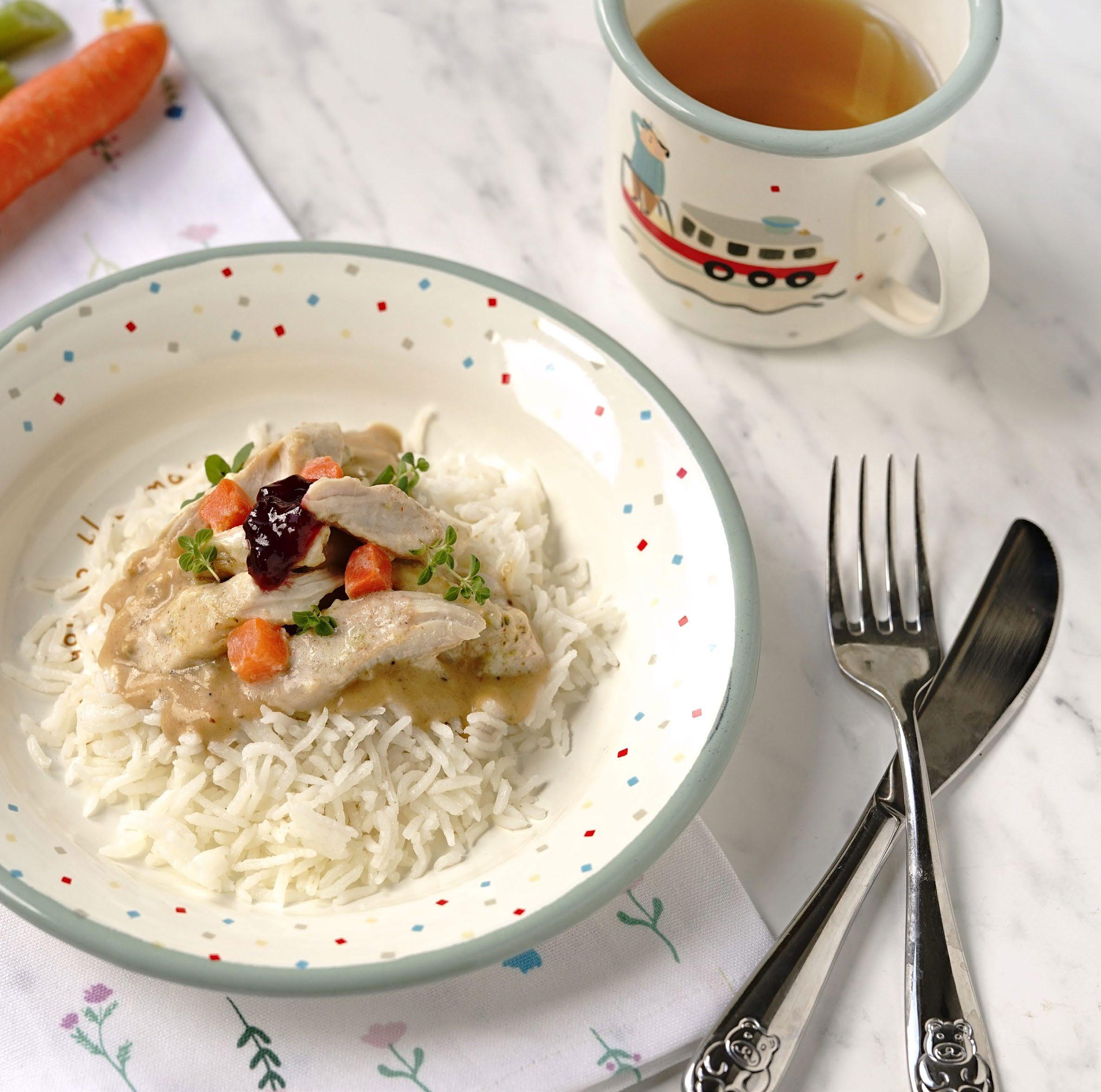 Do hotové omáčky přidejte krůtí nudličky a vše servírujte s uvařenou rýží a případně s troškou brusinek.
