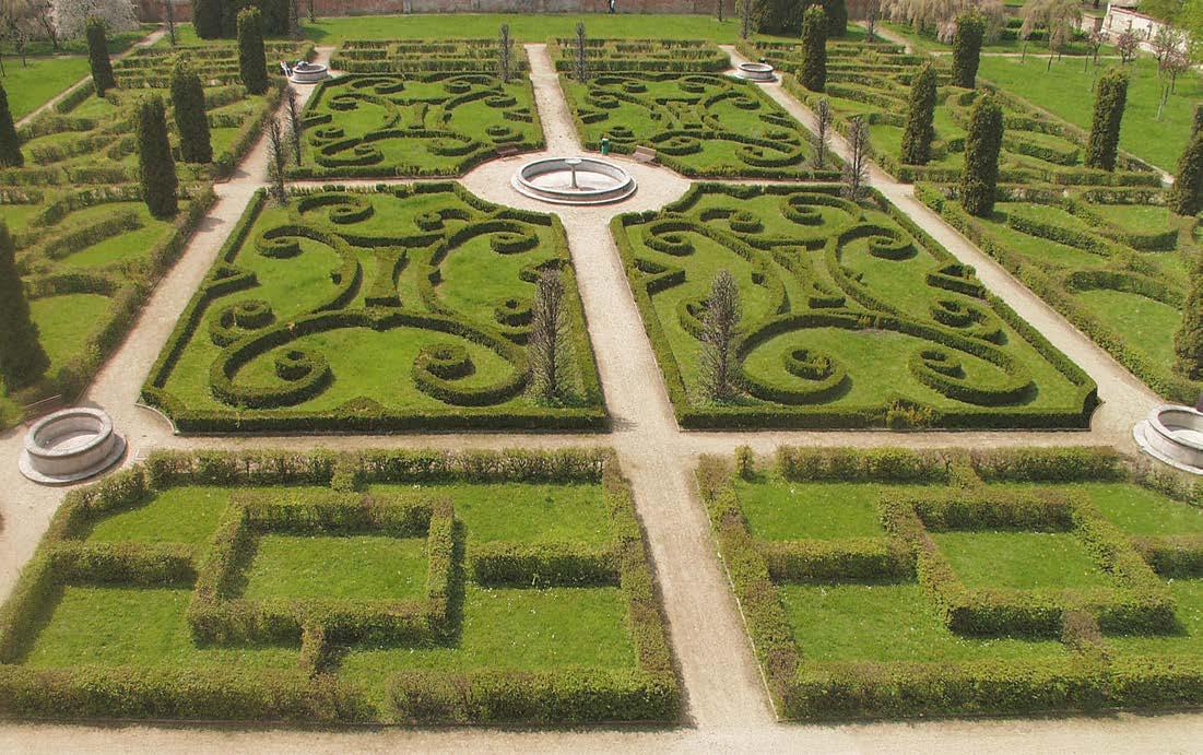 Rekonstruovaná renesanční zahrada u zámku v Bučovicích je sice v detailní údržbě poněkud zanedbaná, v nadhledu z oken zámku však skýtá dobrou představu o pravidelném, osově souměrném uspořádání renesanční formální zahrady s ornamentem broderií bez květinových prvků