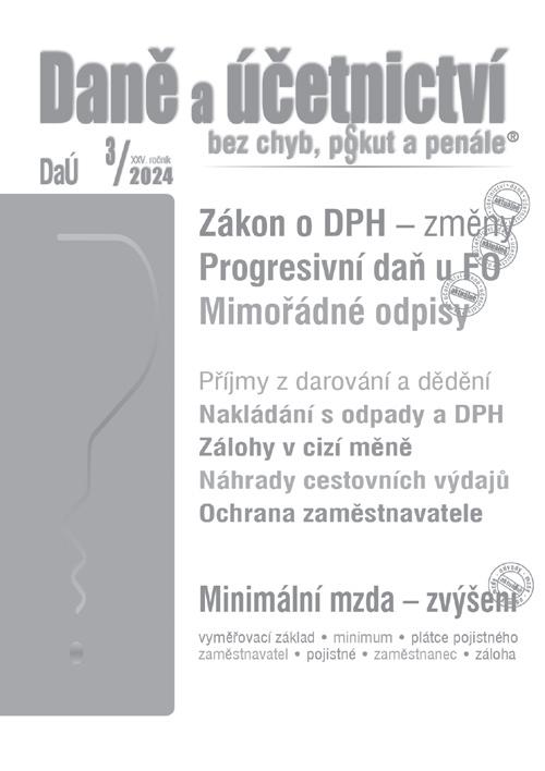 Jaká témata na Vás čekají v našich dalších měsíčnících? V Poradci 9/2024 je uveřejněn Zákon o DPH po novele s komentářem, v Poradci 8/2024 Zákon o preventivní restrukturalizaci s komentářem a příspěvky ke Konsolidačnímu balíčku, v DaÚ 3/2024 Uplatnění mimořádných odpisů v roce 2024, v DÚVaP 3-4/2024 Mzda zaměstnance - zdanění, v 1000 řešení 1-2/2024 Pomocník mzdové účetní k 1. 1. 2024.