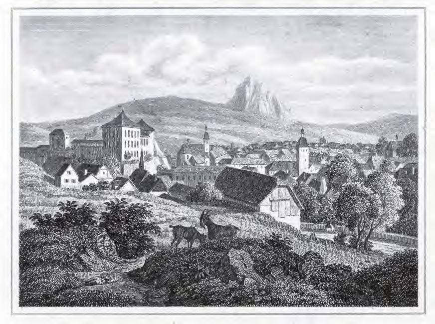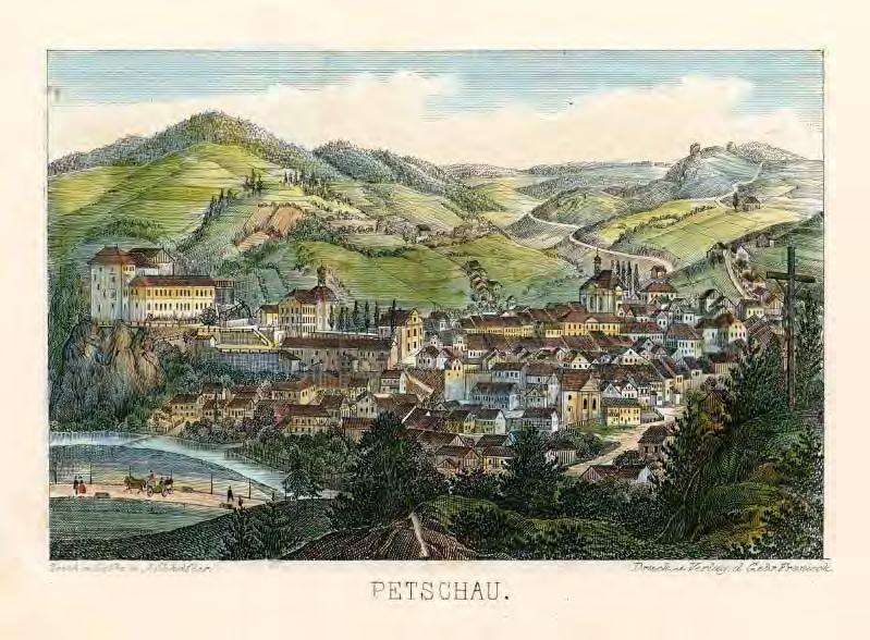 Bílina 1843, pohled od SZ, Wenzel Pobuda, mědiryt, 10 × 7,5, knižní ilustrace, volné dílo, archiv autora
