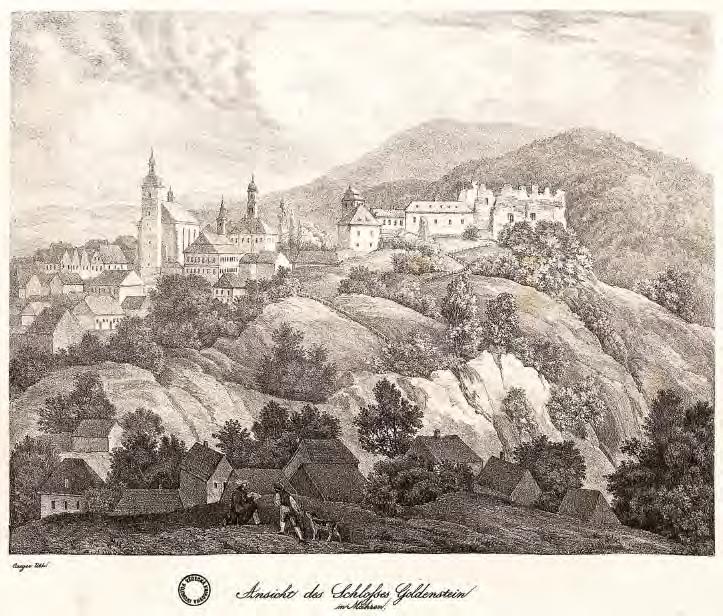 Branná (Kolštejn) 1817, pohled od JZ, parerga na mapě panství, F. V. Horký, kolor. mědiryt, asi 20 × 15, MZK Brno, s. ST Mpa-1208.966