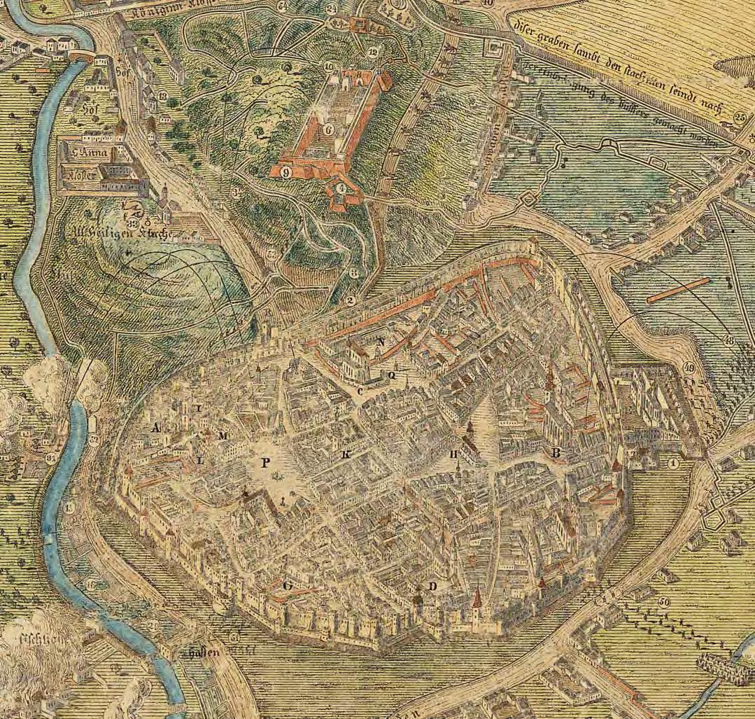 Brno 1650 v kopii z r. 18 45, axonom. pohled od V, za obléhání švédskými vojsky r. 16 45 – výřez, Leopold Pinkawa podle dvojice H. B. Bayer + H. J. Zeiser, bar. zi nkografie, leg. 24+56 zn., AMB, s. U9 K1