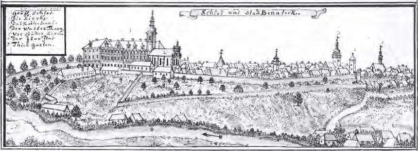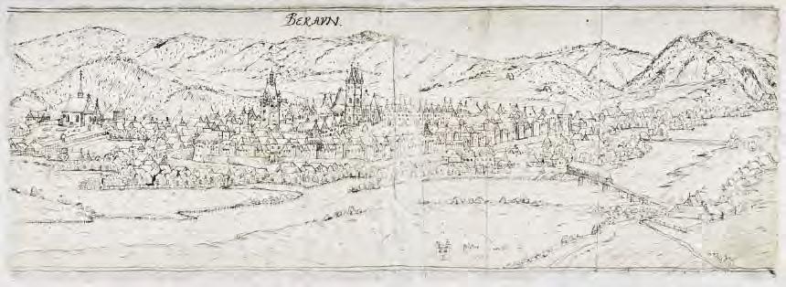 Beroun 1602, pohled z nadhledu od SV (BERAVN), J. Willenberg, perokresba, 52,5 × 18, knihovna KKPS Praha, s. DT I 30