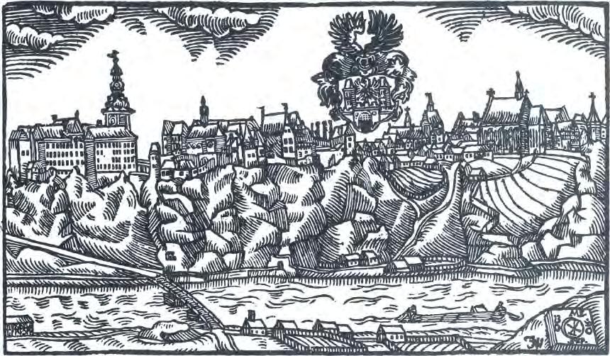 Bechyně 1602, pohled od V přes řeku Lužnici (znak města), J. Willenberg, dřevořez, 14,5 × 8,5, kniha Diadochos, volné dílo