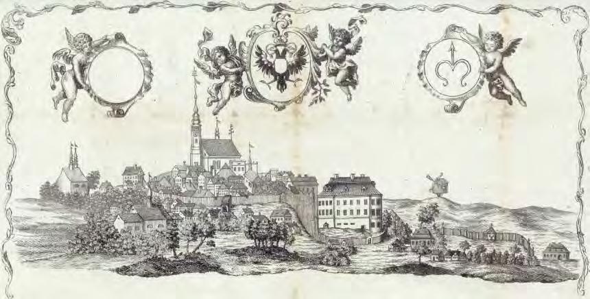 Bílovec před 1808, pohled od JZ (znaky rakouské monarchie a Bílovce), cech. list, anonym, mědiryt, 35,5 × 16,5, SOkA Liberec, fond Cech soukeníků Liberec, i. č. 58, kart. 9