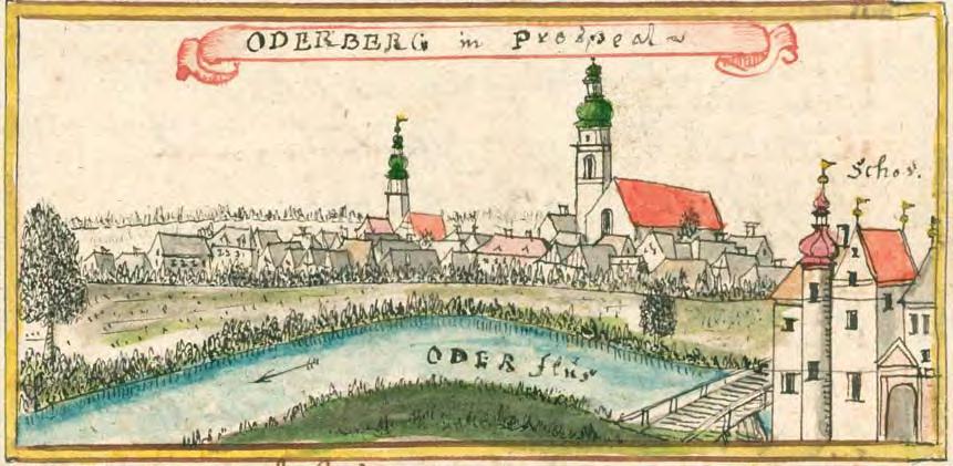 Bohumín 1762–1768, pohled od Z (na Starý Bohumín , ODERBERG in prospect), F. B. Werner, kolor. kresba, 17 × 8,5, soubor TopSl, volné dílo, archiv autora
