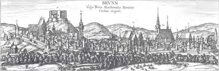 Brno před 1617, pohled od VJV (BRVNN Vulgo Brinn), Georg Hoefnagel kr., rytec Jakob Hoefnagel, mědiryt/lept, 56 × 27, leg. 16 zn., G. Braun COT 1617, volné dílo