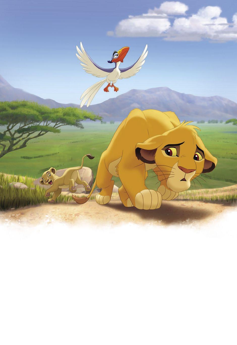 Jenže už bylo pozdě. Zazu si malého prince všiml. „Á, tady jsi, Simbo,“ zakrákoral a přistál přímo před ním. „Pojď se mnou. Čeká nás nabitý den, plný učení a poznávání.“