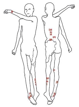 Obr. I.3 Schéma tetování na mumii Ötziho odpovídá dnešním akupunkturním bodům, které se ale do dnešní Evropy dostaly až ve 20. století, a to z Číny. Tyto dvě dávné civilizace spolu tehdy neměly žádné kontakty. (schéma tetování podle Dorfera)
