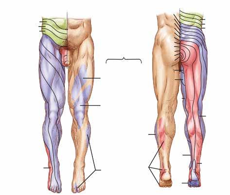Obr. II.6 Dermatomy dolní končetiny (a) a segmentální inervace pohybů dolní končetiny (b) a)