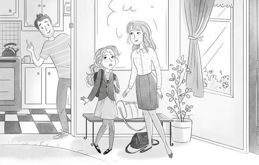 natáčí její první kroky směrem ke vchodu do školy. „Tati, ne. Žádné natáčení, žádné fotografování, žádné objímání! A pokud okamžitě neodejdeme, vyrazím sama na metro, protože jinak přijdu pozdě!“