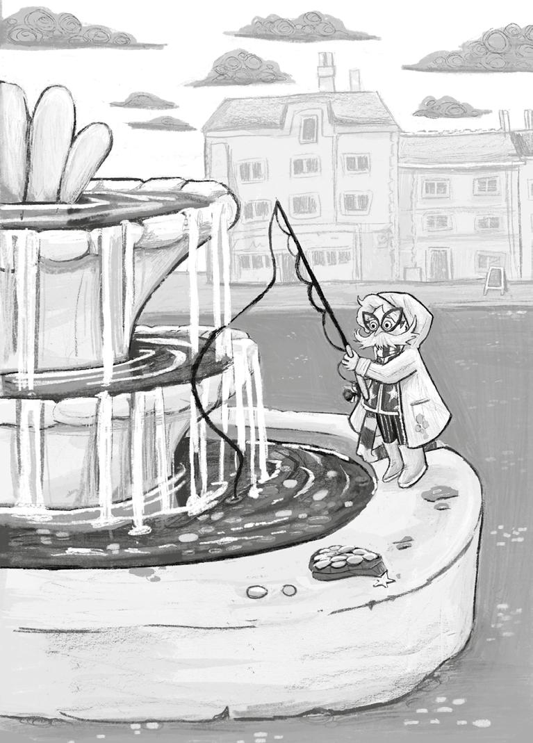 „Aha. No, nevím, proč bych vás neměl vidět, když stojíte přímo tady na fontáně. Je to od vás velice troufalé, dělat to přímo přede mnou. Říká se tomu krádež, víte?“ prohlásil Felix a ukázal na malou hromádku mincí v mužíkově čapce.