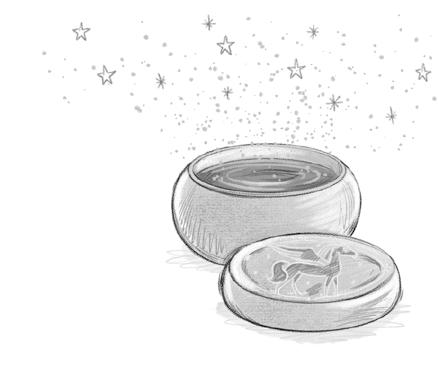 Stříbrná krabička na několika místech zrezla a vypadala, že je strašně stará. Na víčku byla rytina mytického okřídleného koně a krabička byla tak pevně zavřená, že Ella musela vynaložit veškerou sílu, aby ji otevřela. Když se jí to konečně povedlo, celý pokoj zaplnila vůně deště v den letního slunovratu. Pak Ella ucítila slané moře a závan ledového vzduchu. A nakonec ještě něco, co nedokázala rozpoznat… Snad vůni měsíčního svitu? Nikdy si nebyla jistá.