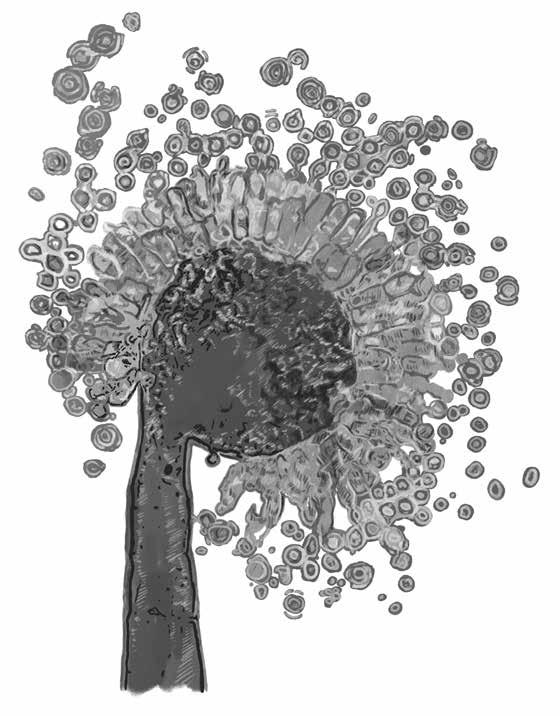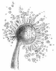 Aspergillus oryzae conidiophore. Ilustrace od Maxe Hulla, založená na mikroskopickém snímku Scotta Chimileskiho.