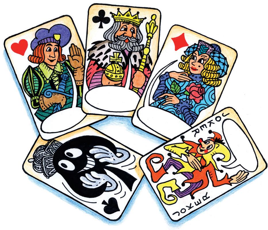 Rozdejte celý balíček žákům a domluvte se, co budete provádět při určité kartě. Například, když se objeví kluk, musí se zvolat “Hello”, když král – “Good morning, Madam!” a „vzdát čest“, tj. zasalutovat, u dámy je třeba říci: “Good morning, my Lord!“, když se objeví eso, musí se zatleskat, když žolík, tak s úklonou říci “Bonžúr, mesjé!“