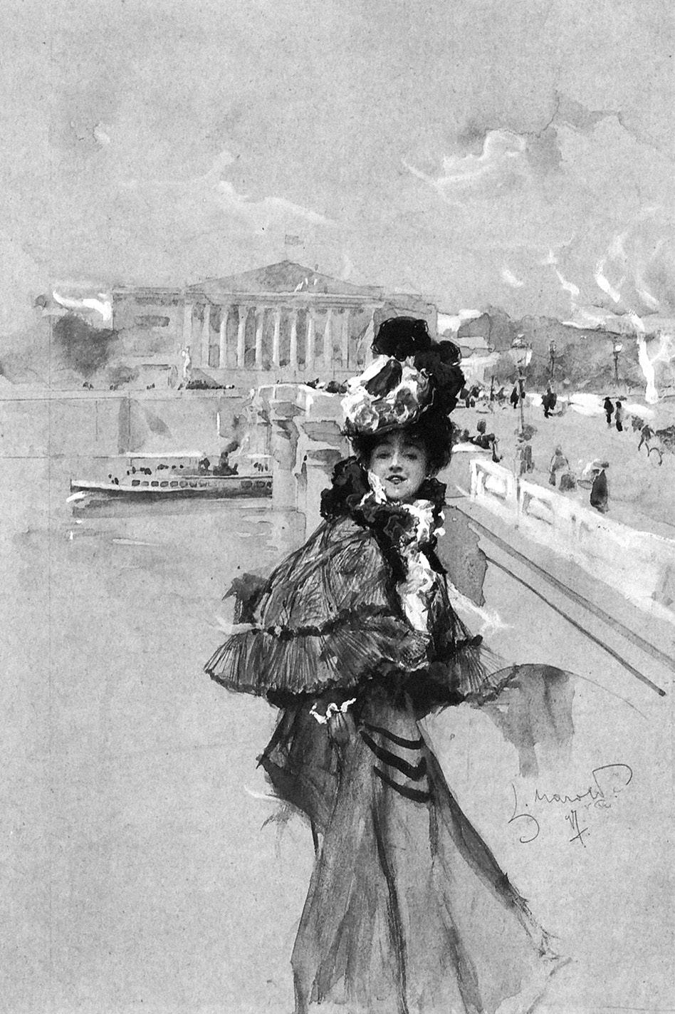 Právě shlíží na město z věže chrámu Notre Dame, pochvaluje si tu šťastnou volbu, nemůže se vynadívat na Seinu, zahrady Tuileries, Elysejská pole, ale všímá si i mizejícího starého města. Jaká je podle jeho pozorování Pařížanka? „Obyčejně menší postavy a více příjemná než krásná; elegantní jednoduchou toaletou, vkusně česaným vlasem, barvou i líčidlem…“