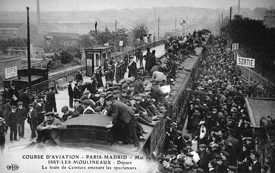 Do Issy les Moulineaux mířily na aviatickou přehlídky tisíce návštěvníků a odvážlivci cestovali i na střechách vagonů.