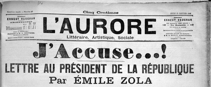 Přichází chvíle pro spisovatele Émila Zolu. Napsal otevřený dopis prezidentu republiky Félixi Fauremu, který vyšel ve čtvrtek 13. ledna 1898 pod titulem J´accuse…! Žaluji! v listu L‘Aurore. Zabíral celou titulní stranu a tře-