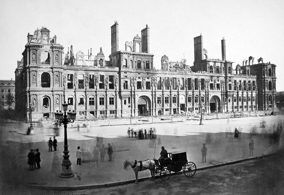 Během bojů s komunardy vyhořel i Tuilerijský palác, kde sídlil nedávno sesazený císař Napoleon III.