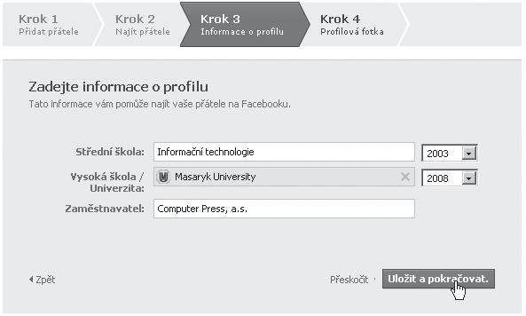 Přidat základní informace, pomocí nichž vás budou moci lidé najít, můžete již při registraci. Lze ovšem pokračovat i bez jejich zadání a zadat/upravit je lze samozřejmě později, v tomto případě se nezdržujte čtením tohoto postupu a krok rovnou přeskočte klepnutím na odkaz Přeskočit