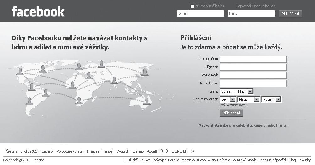 Obrázek 1.1 Hlavní stránka Facebooku, kterou uvidíte vždy před přihlášením ke svému účtu
