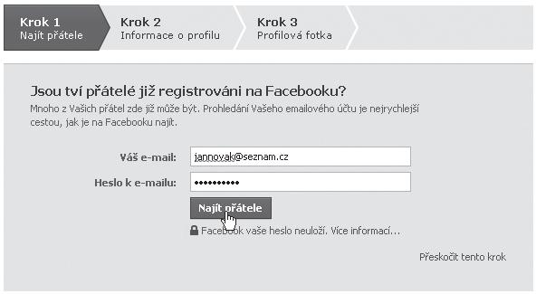 Pokud jste úspěšně provedli předchozí kroky, můžete pokračovat vyhledáním prvních přátel. Toto vyhledání je automatizované a probíhá ověřením kontaktů z vašeho e-mailového adresáře. Pokud tedy chcete tímto způsobem vyhledat své první přátele, zadejte svoji e-mailovou adresu do pole Váš e-mail a heslo pak do pole Heslo k e-mailu . Pokud tímto způsobem nechcete vyhledat přátele či se bojíte o své soukromí, můžete tento krok přeskočit klepnutím na odkaz Přeskočit tento krok ve spodní části rámečku.