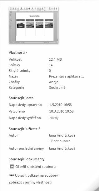 Vlastnosti – v této skupině naleznete informace o velikosti souboru, počtu snímků, počtu skrytých snímků, názvu, společnosti atd. Několik položek lze doplnit také vlastním textem. Prezentaci tak můžete přiřadit například značku, kategorii (např. soukromé, pracovní), komentář, stav (např. rozpracovaná, dokončená) nebo předmět.