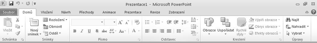 Bezprostředně pod ikonou programu a panelem Rychlý přístup se nachází tzv. pás karet. Je určen pro rychlý a snadný přístup k potřebným nástrojům aplikace Microsoft PowerPoint 2010, které jsou zde uspořádány do logických skupin (tzv. karet) podle účelu použití.