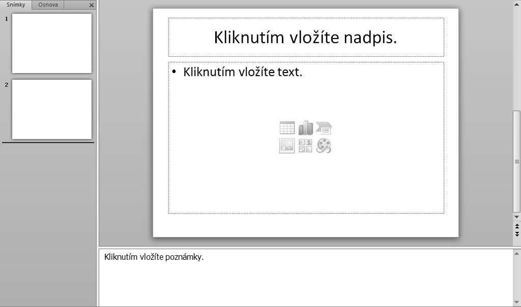 1. Vždy je potřeba v zobrazení Normální nejprve určit místo, kam má být objekt v prezentaci umístěn. Označte buď konkrétní snímek, nebo do určitého místa (např. textového pole) klepněte myší.