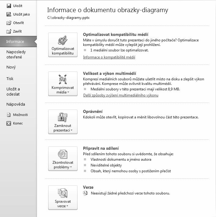 Základní informace o souboru s prezentací naleznete v zobrazení Backstage. Na pásu karet přepněte na kartu Soubor. Zobrazení Backstage vám ve výchozím stavu automaticky nabídne část Informace. Absolutní cesta k souboru s prezentací je uvedena v horní části zobrazení Backstage. Dále je zde umístěno několik tlačítek, jejichž použití je popsáno v samostatných kapitolách: