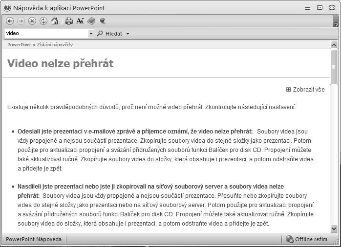 2. Otevře se dialogové okno Nápověda k aplikaci PowerPoint. Podle stavu připojení se zobrazí buď offline nápověda umístěná ve vašem počítači, nebo online nápověda z webu Office. com.