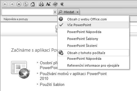 Nápověda k programu Microsoft PowerPoint 2010 se vždy zobrazuje v samostatném dialogovém okně. Do něj se načte obsah nápovědy buď z pevného disku počítače, v tom případě mluvíme o tzv. offline nápovědě, nebo ze sítě Internet (konkrétně z webu Office.com). Taková nápověda je označována slovem online.