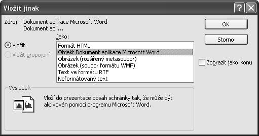4. Pokud vám ani jedna z nabízených možností vložení nevyhovuje, klepněte na tlačítko Vložit jinak. Otevře se stejnojmenné dialogové okno, ve kterém vyberte vhodnou položku v seznamu Jako (např. Objekt Dokument aplikace Microsoft Word) a klepněte na tlačítko OK.
