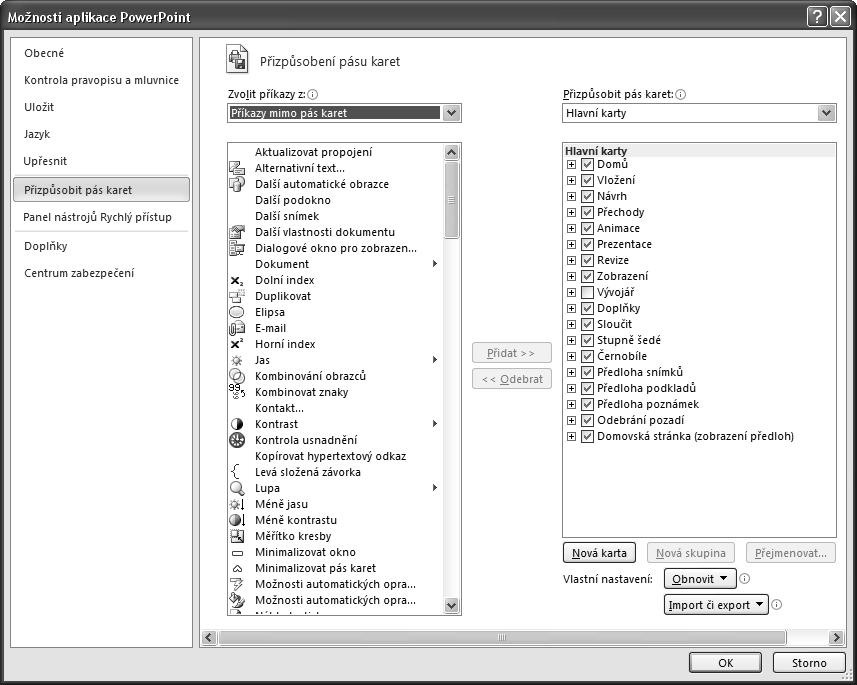 Příkaz otevře dialogové okno Možnosti aplikace PowerPoint, ve kterém lze přizpůsobit funkčnost aplikace. Práci v tomto dialogu se věnujeme podrobně v jednotlivých kapitolách.
