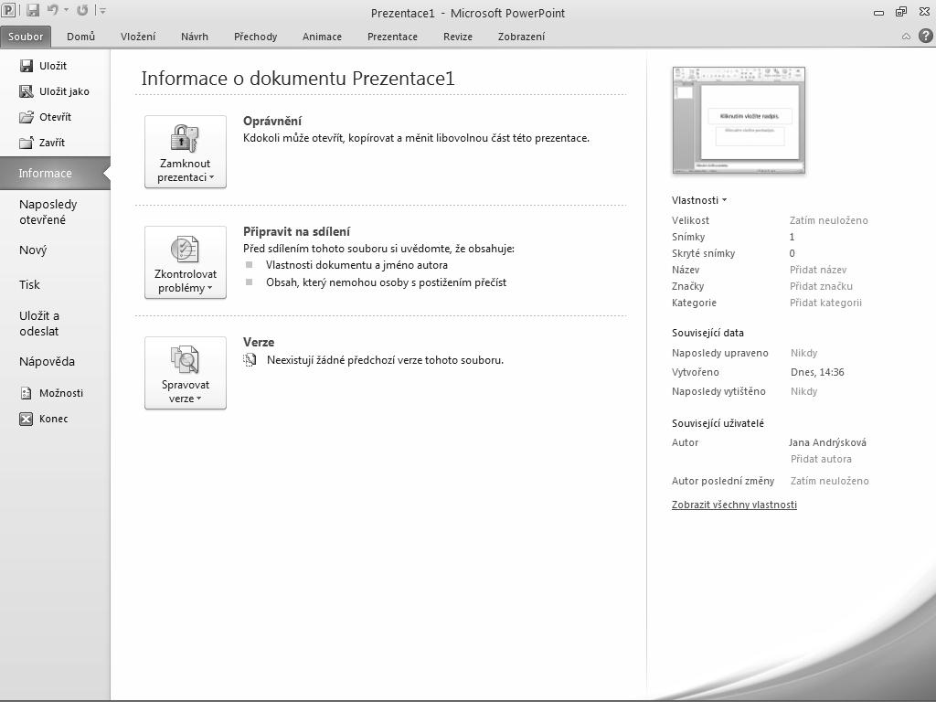 Pravá část zobrazení Backstage nabízí miniaturu aktuálního snímku a souhrnné informace o souboru rozdělené do skupin: