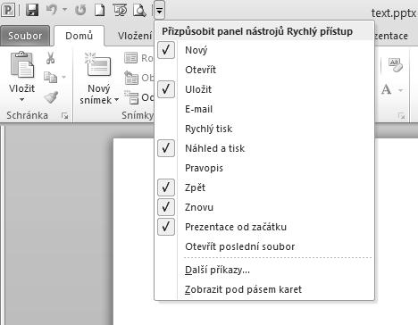 Ve výchozím stavu je v levém horním rohu okna aplikace, vpravo od ikony programu, umístěn také panel nástrojů Rychlý přístup. Obsahuje často používaná tlačítka Uložit, Zpět a Opakovat pro práci se souborem a dále pak tlačítko Přizpůsobit panel nástrojů Rychlý přístup. Tímto tlačítkem zobrazíte nabídku příkazů, pomocí kterých lze upravit vlastnosti tohoto panelu.