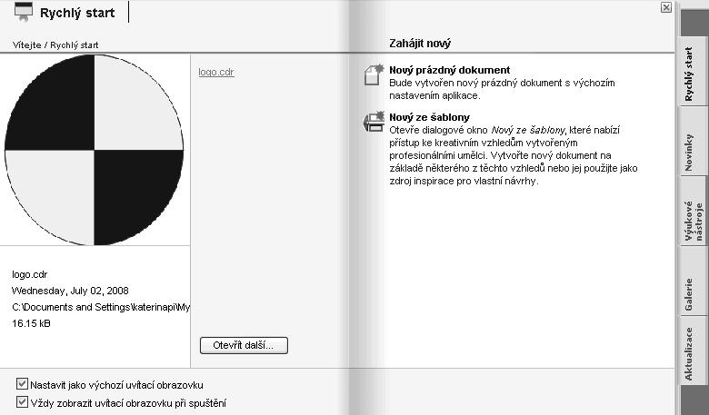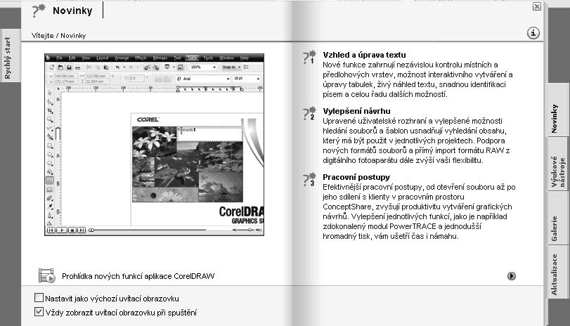 Uvítací obrazovka. Při spuštění programů sady CorelDRAW® Graphics Suite X4 nás uvítá zdokonalená uvítací obrazovka. Ta nám poskytuje rychlý přístup k vytvoření nových dokumentů, k otevření naposledy používaných souborů, předlohám a k různým výukovým materiálům.