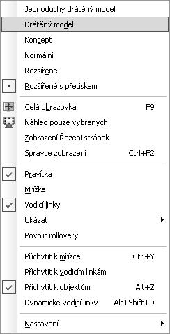 Nabídka Zobrazit (View) řídí zobrazení pracovní plochy a objektů. Dokument lze zobrazit v několika režimech od nejpomalejšího, ale nejvěrnějšího vyhlazeného zobrazení (včetně barev, výplní, tloušťek čar), až po rychlý a jednoduchý drátěný model (pouze obrysy). Lze zapnout náhled obrázku na plnou obrazovku. Důležité je, že nabídka Zobrazit ( View ) obsahuje také příkazy pro zobrazování nástrojů a dalších prvků pracovní plochy (pravítka, mřížky, vodicí linky atd.).
