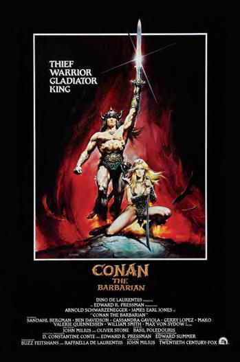 Jedním z nich byl dino de Laurentiis, italský producent, jehož první schůzka s arnoldem tr vala asi minutu. navzájem si „pochválili“ přízvuk, arnold něco prohodil o tom, že takový pidimužík nepotřebuje tak velký stůl, a než se nadál, byl zpátky na ulici. Jenže dino měl práva na Barbara Conana, a když se podíval na jeho komiksovou verzi od franka frazetty, viděl obřího muže se svaly, jež konkurují Supermanovým, s mečem dlouhým jako vagón newyorského metra. kdokoliv jiný než arnold by v té roli vypadal podměrečně, ba přímo směšně. zdlouhavé přípravy umožnily arnoldovi během nabírání svalové hmoty ještě jednou a naposledy vyhrát v roce 1980 titul mr. olympia. byla to kontroverzní trofej, protože tehdy vyhrál spíš jako celebrita než jako majitel největších bicepsů, ale jako motivace k rozloučení s kulturistikou a otevření nové kapitoly to posloužilo dokonale. o rok později už se potil ve Španělsku pod dohledem Johna miliuse, který nemohl uvěřit, že ho Laurentiis nechá za velké peníze natočit pohanský flm, v němž se ve velkém sekají hlavy a kněžky lásky jsou obětovány přerostlým hadům. arnold se poranil při máchání mečem, nechal se vláčet opravdovými vlky, rozrazil si hlavu při pádu ze skály, ale milius byl nadšený a řval, že lepší záběry si nikdo nemohl přát.