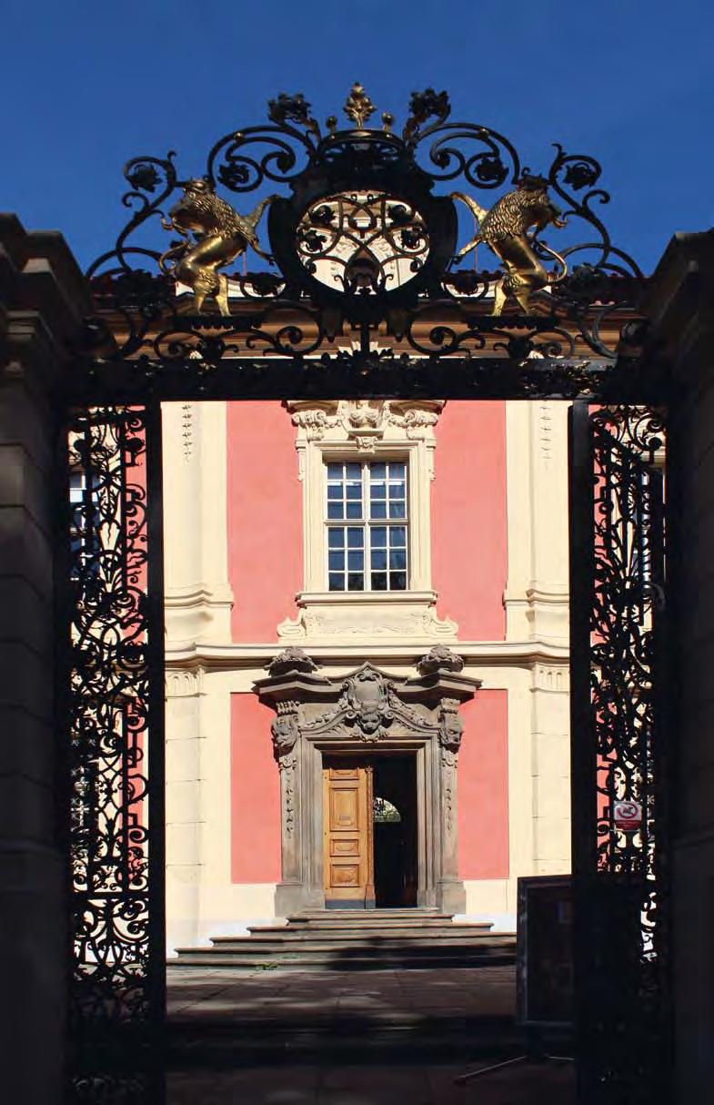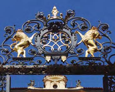 Jedna z plastik u vstupního pavilonu 25 Pozlacení lvi nad vraty drží erb s monogramem M 26 Barokní portál vily Voračických