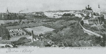 Brána tajemství 02 Ještě v roce 1899 většinu plochy u novoměstských hradeb zabíraly zahrady (Zdroj: www.fotohistorie.cz)