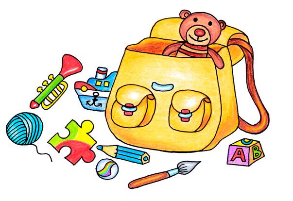 9 Do batůžku dáme 5–8 drobných předmětů. Dítě strčí