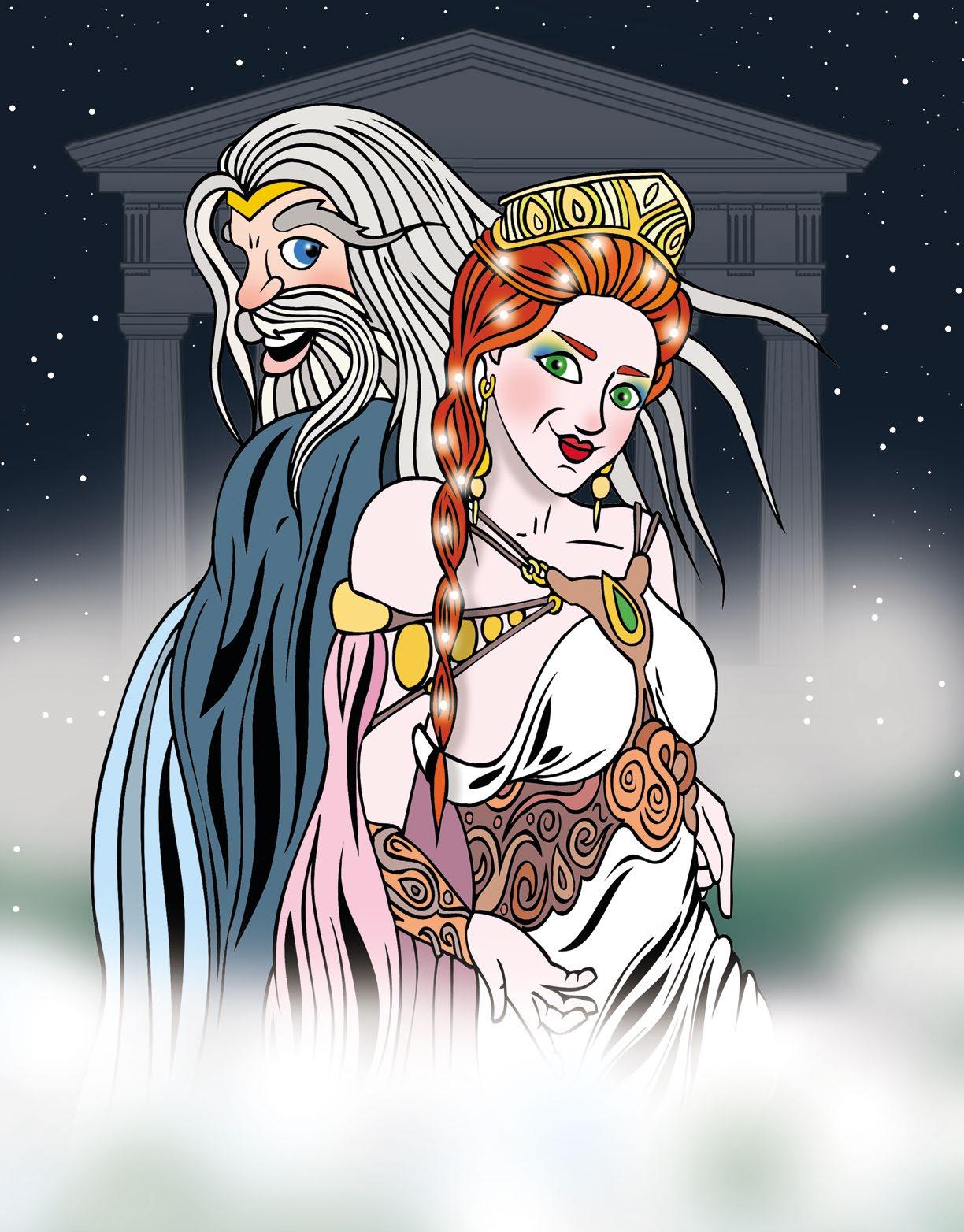 „Ehm, ehm, ehm,“ odkašlal si Héřin manžel, bůh Zeus, „s tvým laskavým dovolením, ženo má nejdražší, nejvyšší bůh jsem tady na Olympu já. Takže porady vedu, a tedy rov