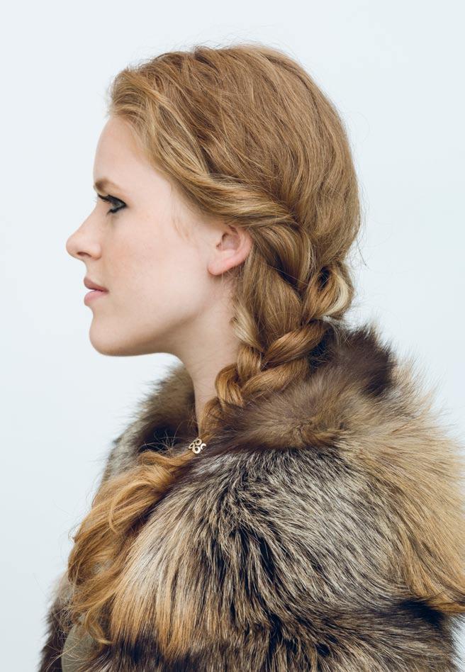 Klasický postranní cop se skvěle hodí pro hodně vlnité a kudrnaté vlasy. Vždycky je dobré sčesat si vlasy z obličeje. Snad ještě důležitější to bylo za Vikingů, kdy měly ženy pořád plné ruce práce! Postranní cop lze vhodně doplnit pěkným prstenem s charakteristickým vikingským motivem. Vidíte? Já jsem zde použila namísto kroužku do vlasů prsten.