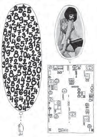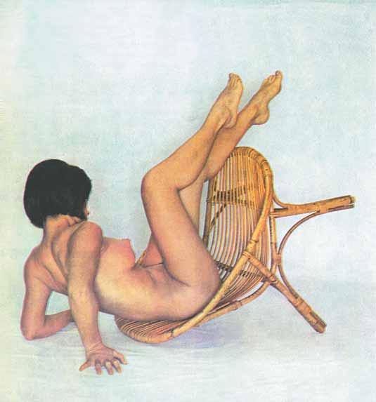 Uvolňování sexuality a erotiky bylo i v Československu v šedesátých letech 20. století všudepřítomné, na stránkách časopisů (obrázek nahoře) avizuje pro následující číslo reklamního magazínu „Ave Eva“ odbornou studii k „sezení“ s příspěvky lékařů, architektů), v reklamních letácích (na obrázku dole uprostřed firma Ergon představuje chrániče sluchu), tak v popularizujících i odborných studiích (obrázek dole vpravo) doprovázel vysoce odborný, faktografií nasycený článek o průběhu a výsledcích XV. evropského kongresu leteckého a kosmického lékařství v Praze 1966. Kresba: Vlasta Zábranský (repro z: Věda a život 1970, č. 12).