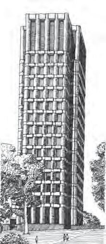 P. Johnson: Klinovy laboratoře Univerzity v Yale, 1962–1966, Connecticut, USA; kontroverzní estetika výškové budovy odkazuje na historii a dosahuje i určitého monumentalismu. Kresby: O. Okamura