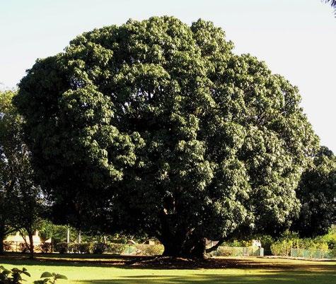 borku, dospělé listy jsou lesklé, svrchu tmavě zelené, zespodu světlejší. Jsou dlouhé až 30 cm a široké kolem 5 cm. Květy s pěti korunními lístky rostou ve vzpřímených mnohokvětých latách. Lístky mají barvu od světle krémové až po růžovou. Otvírají se jen v noci a časně z rána. Ovoce je oválné, někdy téměř kulaté, o velikosti 8–25 cm, velmi záleží na varietě. Barva kožovité slupky přechází od tmavě zelené až do oranžové nebo červené, se světlými skvrnami, dužina je oranžová. Pecka je poměrně velká a plochá a obsahuje nejčastěji jedno škrobovité semeno. Vůně plodu je sladkokyselá, trochu pryskyřičná, chuť příjemně sladká, lehce nakyslá.
