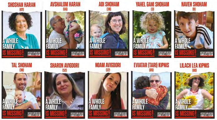 7. října Juvalovi zmizela skoro celá rodina. Nahoře zleva: maminka Šošan (unesena, propuštěna v listopadu), táta Avšalom (zavražděn teroristy 7. 10.), sestra Adi (unesena, propuštěna v listopadu, stejně jako její děti Jahel a Nave. Dole zleva: švagr Tal (unesen, nadále zadržován v Gaze), teta Šaron (unesena, propuštěna v listopadu, stejně jako její dcera No‘am), strýc Evjatar a teta Lilach (oba zavražděni teroristy 7. 10.). Foto: Hostages and Missing Families Forum.