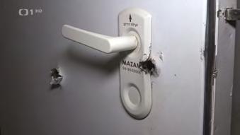 Metodický „lov“ na lidi. Domácí kryt a dva průstřely v jeho dveřích. Foto: repro blízkovýchodní štáb ČT, 23. 10. 2023.